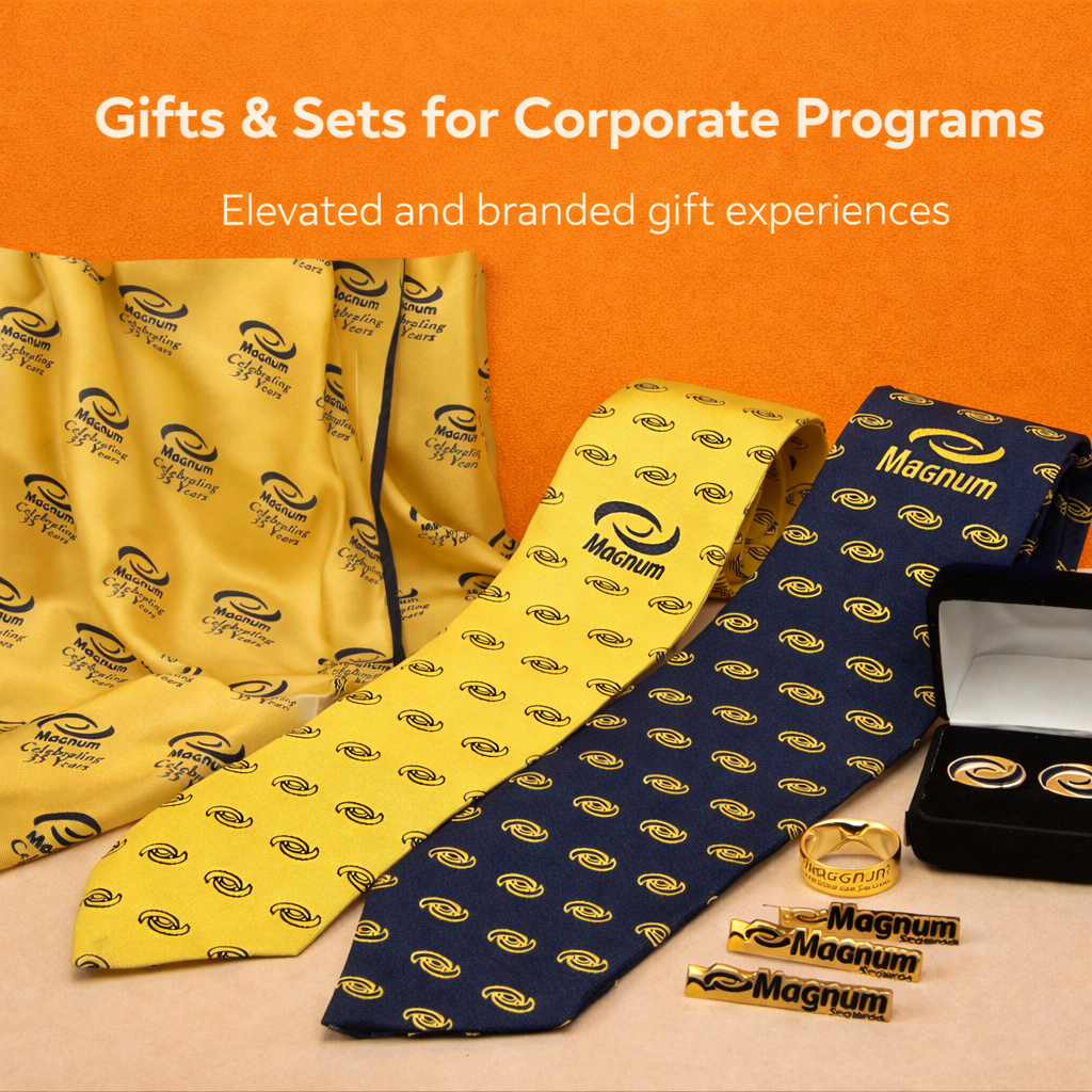 Refined corporate gift sets featuring custom-printed silk ties and scarves, paired with bespoke tie clips, scarf rings, and cuff links—expertly designed to reflect your brand identity with elegance and lasting impact by Art4Brand.com.