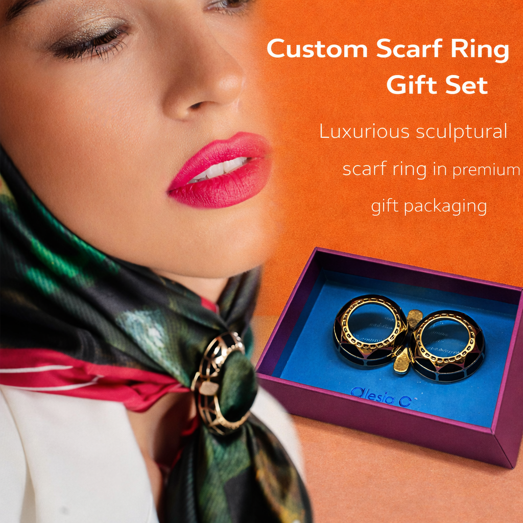 An elegant custom gift set pairing a luxurious designer silk scarf with a sculptural scarf ring, thoughtfully curated to create a refined statement piece. The silk scarf—artfully designed with rich color and movement—is styled with a signature scarf ring crafted in filigree or modern sculptural form, finished in gold-plated or enamel-accented metal.