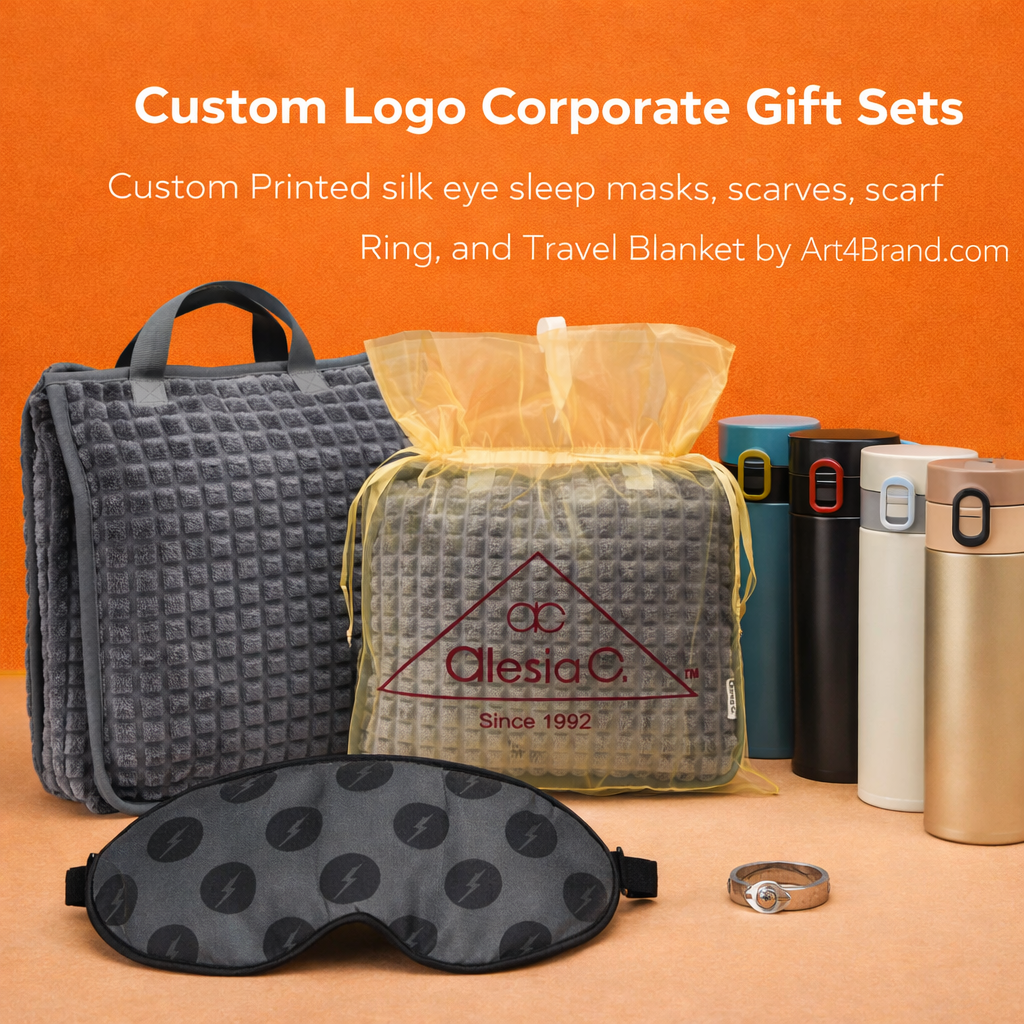 A sophisticated luxury gift set combining a plush travel blanket, silk sleep eye mask, refined scarf ring, and insulated bottle—thoughtfully curated and customizable with your logo and brand colors to create an elegant, memorable corporate gifting experience.