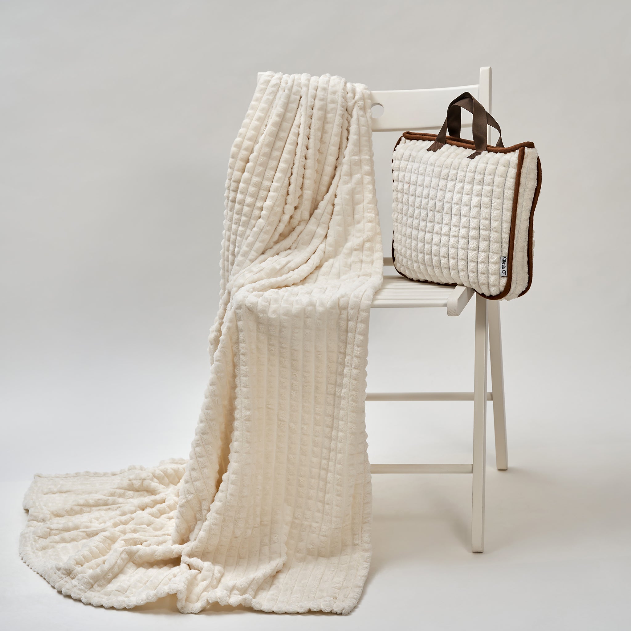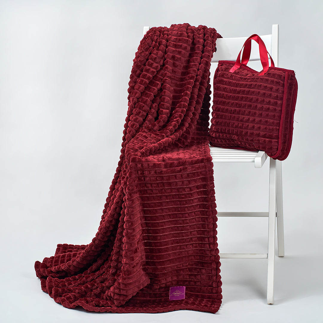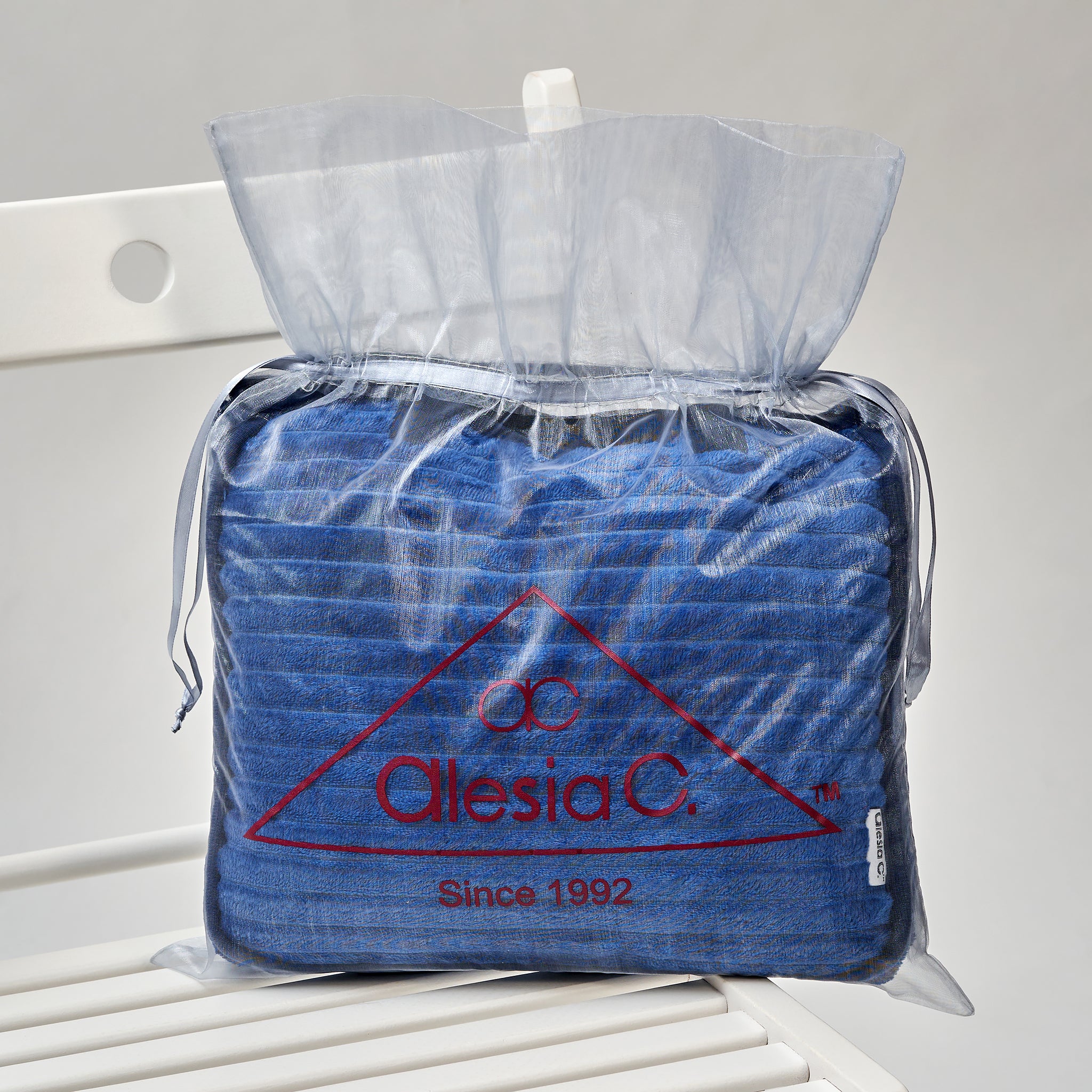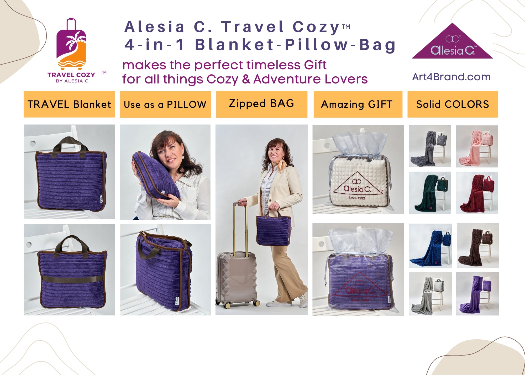 Introducing Alesia C. Travel Cozy Collection: A 50”x60” blanket with plush blanket velour bag for storage and travel. Our customized blankets bag features jacquard handles, zipper closure, and luggage strap for easy transport. Crafted of reversible stripe embossed jacquard plush. Converts into a pillow or lumbar support. Multi-functional 4-in-1 designer travel cozy blanket. Perfect gift for loved ones, employees, or clients.