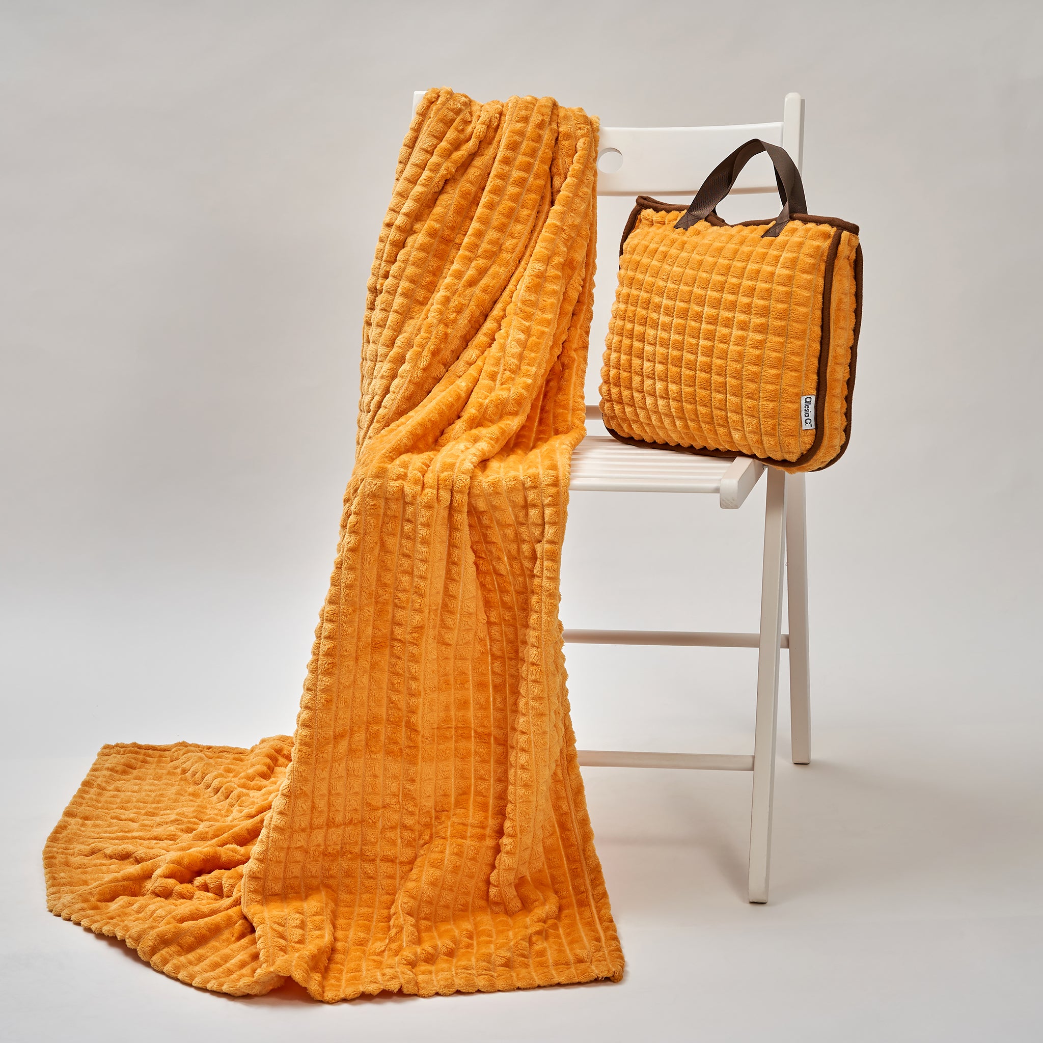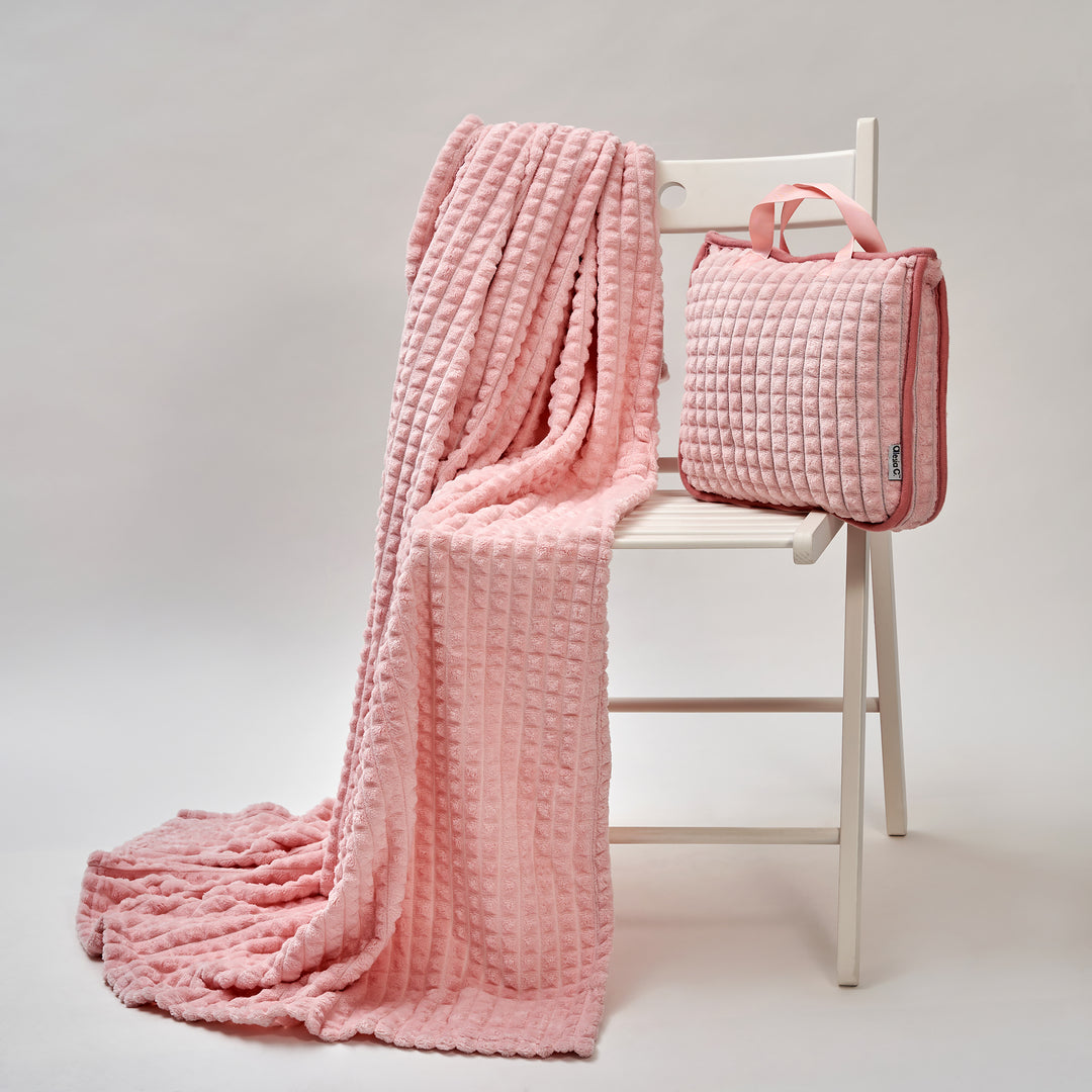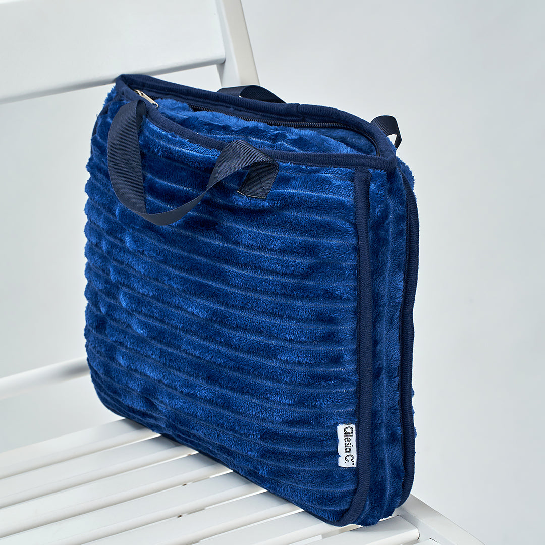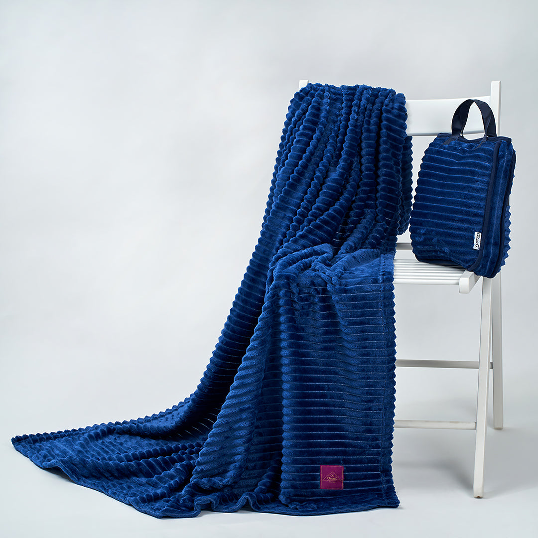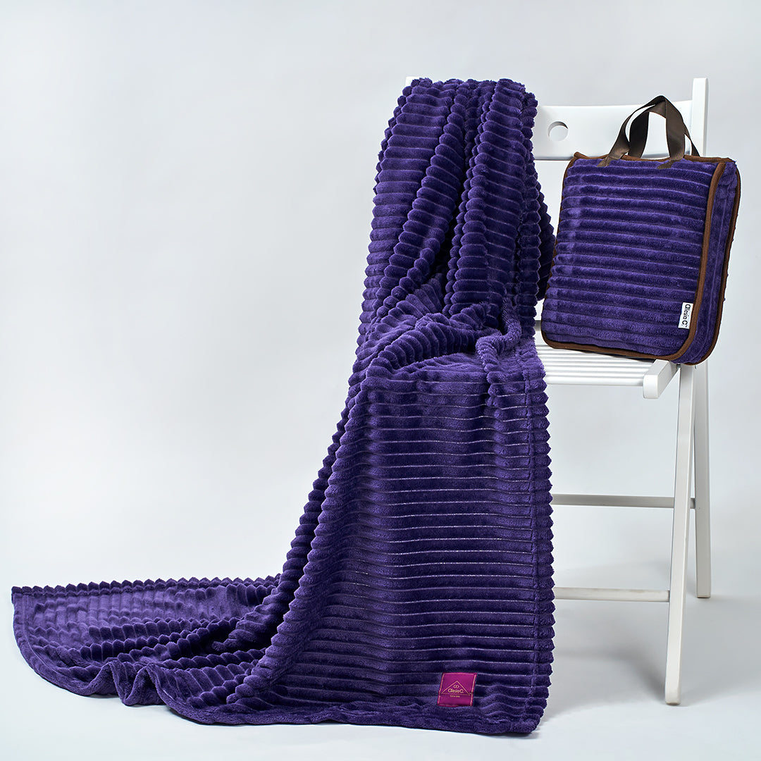 Introducing Alesia C. Travel Cozy Collection: A 50”x60” blanket with plush blanket velour bag for storage and travel. Our customized blankets bag features jacquard handles, zipper closure, and luggage strap for easy transport. Crafted of reversible stripe embossed jacquard plush. Converts into a pillow or lumbar support. Multi-functional 4-in-1 designer travel cozy blanket. Perfect gift for loved ones, employees, or clients.