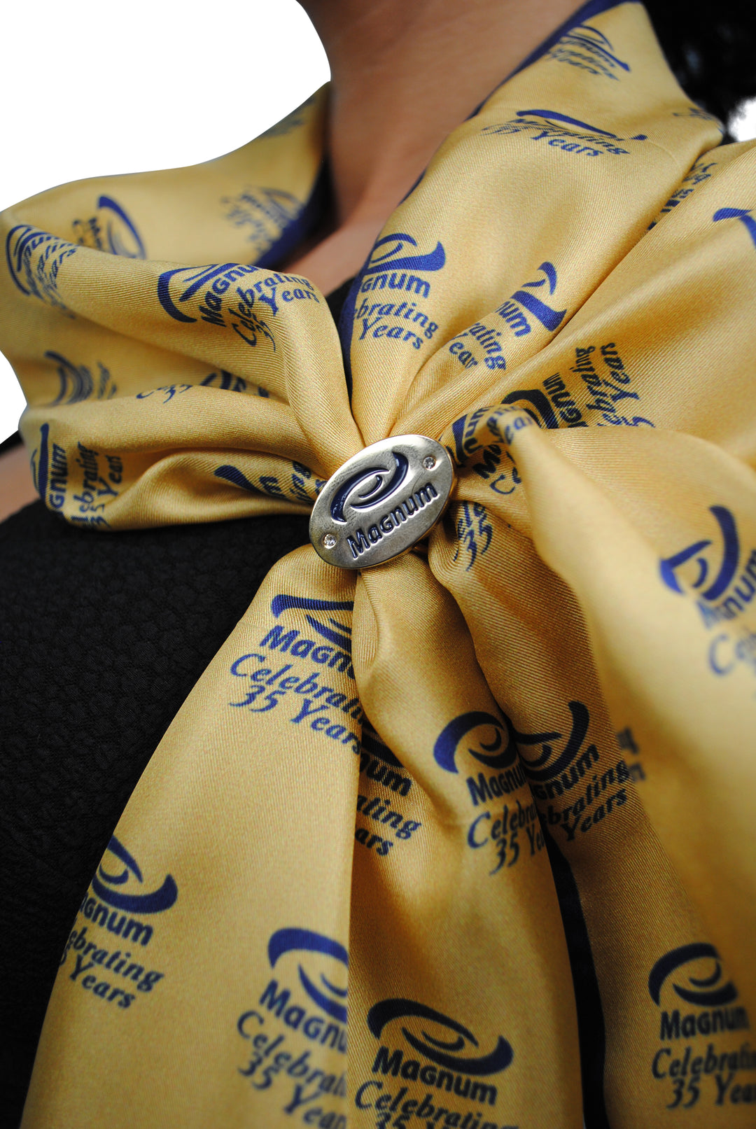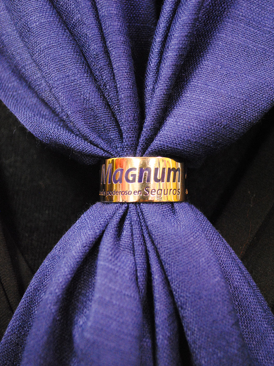 Custom scarf rings featuring the MAGNUM logo and symbol, designed with enamel-engraved detailing in navy blue corporate colors and finished in gold-plated metal for a refined, brand-forward statement.