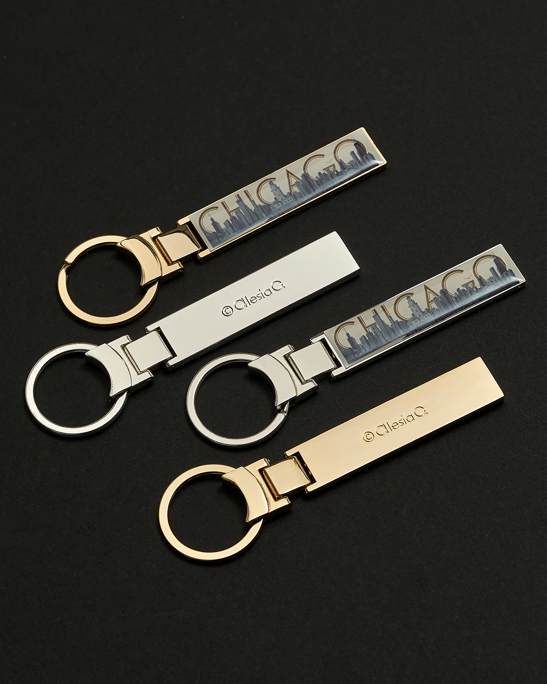 EXAMPLE: Custom and bespoke metal key chains featuring a hand-sketched Chicago skyline by Alesia Chaika, transformed into a luxurious 3D raised design with finely sculpted details that honor the original artwork. Finished with a precisely engraved logo on the back for a refined, lasting brand signature.