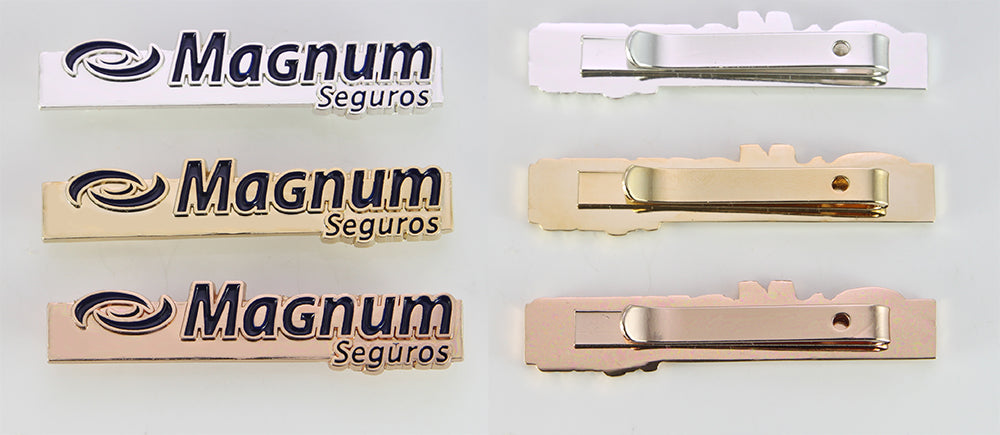 Custom tie clips featuring the MAGNUM logo and symbol, crafted in a refined enamel-engraved design with navy blue corporate color detailing and finished in gold-plated metal for a polished, executive look.