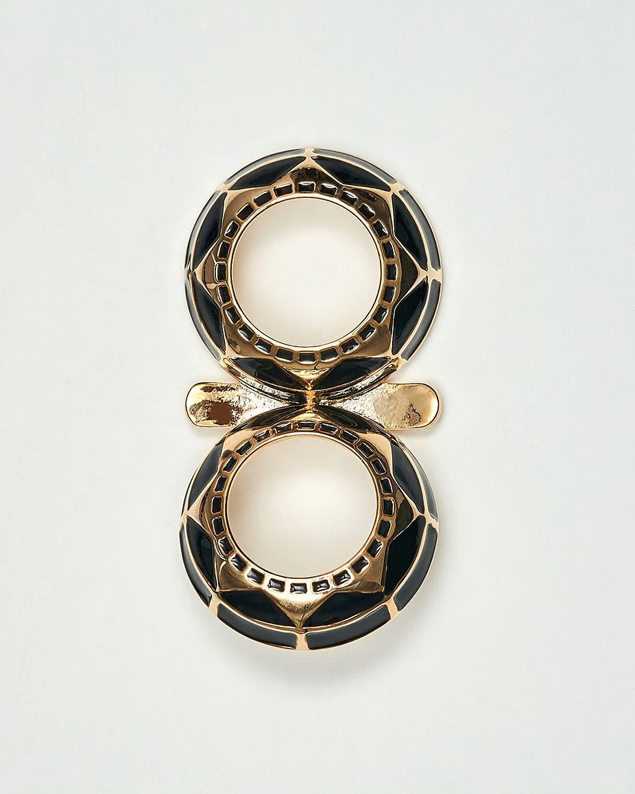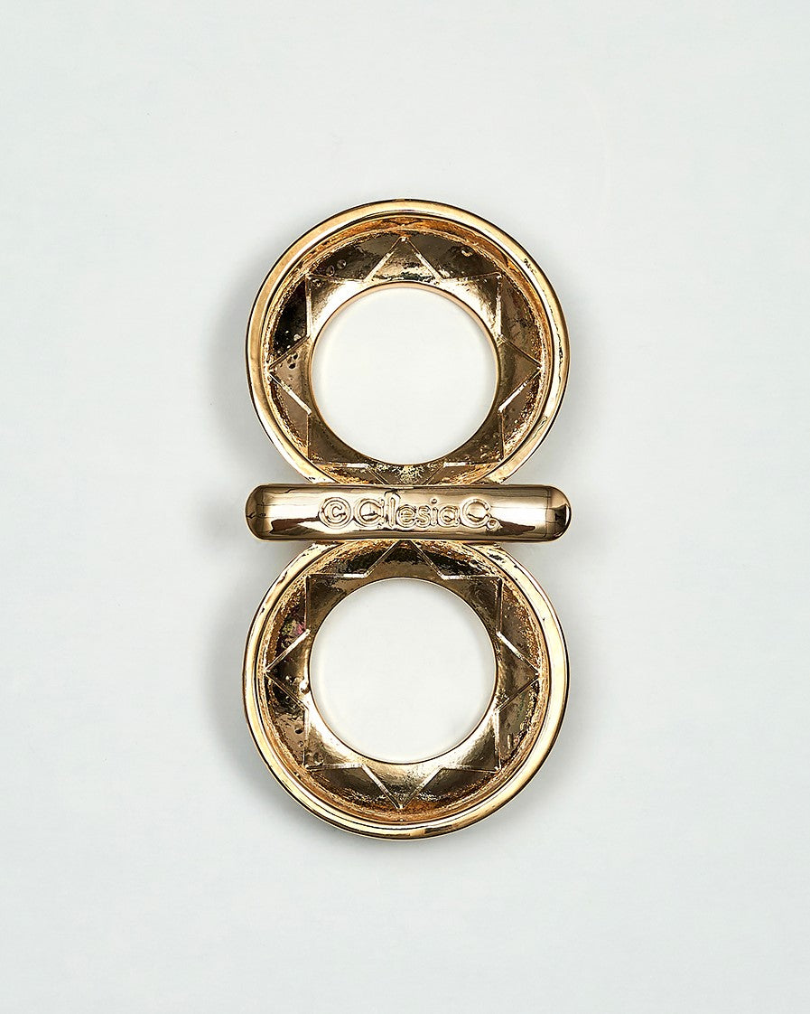 EXAMPLE: Bespoke Alesia C. Infinity8 scarf rings in 18K gold-plated brass, featuring an enamel triangle pattern with the signature Alesia C. logo and an engraved mark on the back—timeless scarf jewelry with a refined architectural touch.